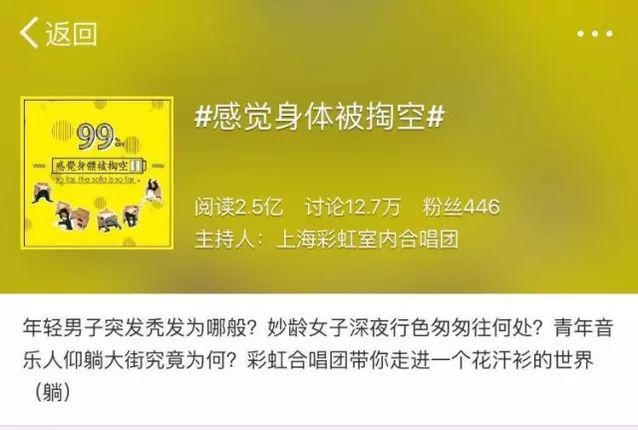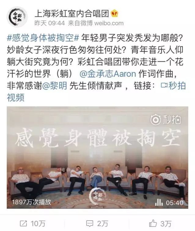 昨天一整天,榜妹的朋友圈都被一首神曲刷屏了。歌名很污,叫《感覺(jué)身體被掏空》。在好奇心的驅(qū)使下榜妹聽(tīng)完了,沒(méi)想到,其實(shí)太魔性,于是背著老板聽(tīng)了一遍又一遍。 假如你還沒(méi)有聽(tīng),趕快戳下方視頻! 聽(tīng)完你一定會(huì)轉(zhuǎn)發(fā)的 不得不說(shuō),這首神曲又將成為霸占輿論高地的一枚爆款。而這首神曲的背后創(chuàng)作團(tuán)隊(duì)——上海彩虹室內(nèi)合唱團(tuán), 這次是如何在短時(shí)間內(nèi)打造出爆款神曲的呢? 昨天上午9點(diǎn)40分左右,“上海彩虹室內(nèi)合唱團(tuán)”推送了一篇《“汪汪汪!汪汪汪汪汪汪汪汪!”》的文章,其中插入了這首《感覺(jué)身體被掏空》的短視頻。與此同時(shí),其官方微博也發(fā)布了該視頻,并配文“年青男子突發(fā)禿發(fā)為哪般?妙齡女子深夜形色匆匆往何處?青年音樂(lè)人仰躺大街畢竟為何?” 發(fā)布八小時(shí)后,公家號(hào)文章迅速破10w+,并且在當(dāng)晚11點(diǎn),該視頻在秒拍的播放數(shù)達(dá)到1111萬(wàn)。 截至到今天下戰(zhàn)書(shū)14點(diǎn)30分,這篇《“汪汪汪!汪汪汪汪汪汪汪汪!”》閱讀達(dá)到14萬(wàn),后臺(tái)粉絲增長(zhǎng)13000。 @上海彩虹室內(nèi)合唱團(tuán) 發(fā)布的這條微博閱讀達(dá)到1796萬(wàn),轉(zhuǎn)評(píng)12萬(wàn),點(diǎn)贊3萬(wàn)。意外之喜是,僅僅一天的時(shí)間,微博的粉絲就從原先的1.5萬(wàn)增長(zhǎng)至7.5萬(wàn),凈增6萬(wàn)粉絲,秒拍上的視頻播放量也達(dá)到了1842萬(wàn)。