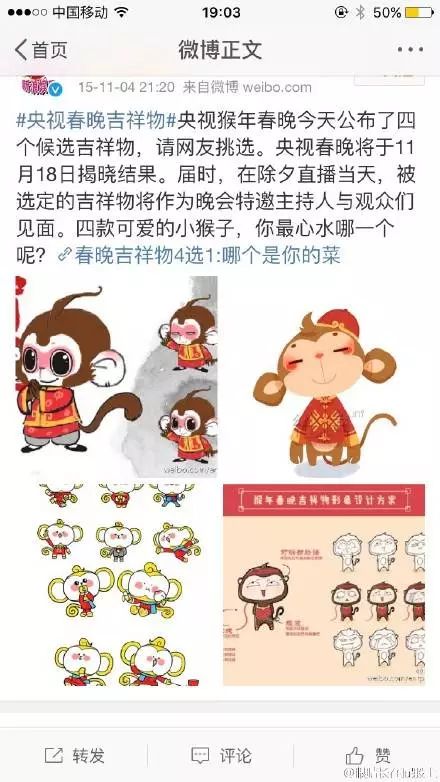也難怪在央視發(fā)布吉利物的半個小時內(nèi),評論就已經(jīng)由萬,微博話題#猴年春晚吉利物#三個小時閱讀量就達811萬,討論5.3萬,登上微博排行榜第一名。