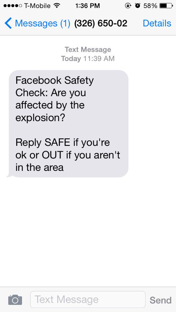 (圖片來(lái)源:推特) 可是當(dāng)戴爾先生慌忙望向窗外,卻只見(jiàn)天空晴朗,街道上行人自若,哪有半點(diǎn)失事了的痕跡?類(lèi)似的短信也發(fā)到了印度等國(guó)家Facebook用戶的手機(jī)上,用戶之間廣泛傳播,一時(shí)間人心惶惶。 事實(shí)上,這是在當(dāng)天巴基斯坦發(fā)生爆炸事件后,F(xiàn)acebook啟用平安信使功能,將通知發(fā)送給受到波及的地區(qū)用戶,讓他們?cè)贔acebook上向親朋摯友報(bào)個(gè)平安。但由于程序錯(cuò)誤,這則信息被發(fā)送到了遠(yuǎn)在美國(guó)、歐洲、東亞的用戶,不明真相的用戶接到提醒后,造成了小規(guī)模的恐慌。 烏龍事件在推特等社交網(wǎng)絡(luò)上引發(fā)燒議,有用戶批評(píng)Facebook是在添亂。Facebook官方也在晚些時(shí)候發(fā)出報(bào)歉。