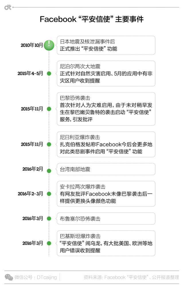 (圖片來(lái)源:Facebook平安信使頁(yè)面) “平安信使”已經(jīng)推出了若干次盡管“平安信使”從推出到現(xiàn)在發(fā)生了一些烏龍,還由于這個(gè)功能涉及到定位追蹤和個(gè)人隱私的保護(hù),也引發(fā)多次爭(zhēng)議。 不外這項(xiàng)服務(wù)的推出仍舊受到了良多歡迎,并且為實(shí)際救援提供了作用。 Facebook是第一個(gè)在大型災(zāi)害事故上系統(tǒng)推出報(bào)平安服務(wù)的社交媒體。災(zāi)害事件發(fā)生的時(shí)候,通信常常不暢,受影響地區(qū)的用戶會(huì)接收到大量的和災(zāi)害相關(guān)的信息以及親朋摯友的關(guān)心,傳統(tǒng)的通信方式效率低下,而龐大的社交網(wǎng)絡(luò)則是提供這一公共服務(wù)的最佳平臺(tái)。同時(shí),你也可以看到自己摯友的報(bào)平安狀態(tài),以確定他們所處的情況。 這一功能最初是受日本地震及核泄漏事件啟發(fā),起初只是針對(duì)天然劫難。而去年巴黎恐怖襲擊后,F(xiàn)acebook首次針對(duì)人為災(zāi)害啟用平安信使,據(jù)Facebook自己公然的數(shù)據(jù),410萬(wàn)用戶在巴黎襲擊后24小時(shí)內(nèi)匯報(bào)了平安,占了巴黎總?cè)丝诘慕种弧_@些報(bào)平安的帖子經(jīng)由大量傳播,終極看過(guò)報(bào)平安狀態(tài)的用戶數(shù)達(dá)到3.6億之多。