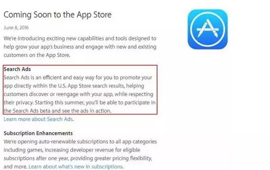付費(fèi)推廣 App 展現(xiàn)方式示意圖 另外,每一個(gè)搜索結(jié)果頁面只會(huì)泛起一個(gè)付費(fèi)推廣的 App,蘋果會(huì)以類似 Google Adwords 的付費(fèi)網(wǎng)絡(luò)推廣系統(tǒng)來決定哪些應(yīng)用泛起在用戶的搜索頁面。 2015年,全球蘋果用戶在 App Store 消費(fèi)的金額超過200億美元,可用的 App 更是多達(dá)190萬種,這也導(dǎo)致了應(yīng)用曝光的難度加大,良多開發(fā)者反映,在 App Store 上應(yīng)用曝光的機(jī)會(huì)越來越少,也越來越難題,甚至催生了大量的第三方刷榜機(jī)構(gòu),這不管是對于用戶仍是開發(fā)者都并非好事。蘋果表示,這次新增的付費(fèi)推廣功能將可以匡助更多的 App 取得曝光的機(jī)會(huì),也可以讓用戶更利便的獲取到優(yōu)秀的應(yīng)用。 蘋果官方公布, App Store 2.0 將會(huì)首先在北美進(jìn)行測試,在今年秋季正式上線。 |