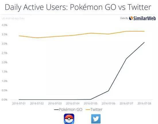 Pokémon GO 與 Twitter 的日活躍用戶量對比 玄色是Pokémon GO,黃色是 Tinder