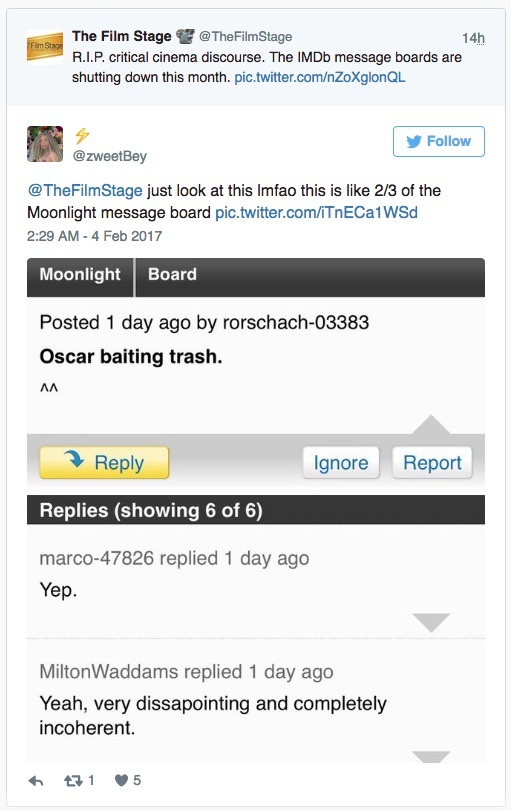 美國時間 2017 年 2 月 3 日,IMDb 公布將于 2017 年 2 月 20 日正式封閉留言板功能(Message Boards),而供用戶進行溝通的私信功能(Private Message)也將隨之下架。 成立于 1990 年,IMDb(Internet Movie Database,互聯網片子數據庫)是國際著名的片子、電視和名人資訊網站,以其“神秘且權勢巨子”的評分機制、龐大齊全的片子電視資料庫著稱。 除了常規(guī)的影視基本資訊外(如上映時間、演員和制作團隊、預報片、作品評論等),在每個影視作品條目下還會包括良多“影迷范兒”十足的用戶出產內容(UGC),如:經典語錄(Quotes)、片子漏洞(Goofs)、冷知識(Trivia)、片子原聲等,是不少深度影迷觀影前后必到“圣地”。 影視作品作為一種可解讀性極強的文本,離不開觀眾對于文本甚至人物的討論,而這一任務則由“留言板”來承載。固然名為“留言板”,但該功能實在就是“論壇”,注冊用戶針對不同條目創(chuàng)建話題,發(fā)起討論。除了每個影視作品、人物條目下都會配備留言板以外,IMDb 還設置了 47 個主要討論版塊,并有超過600 萬注冊用戶使用過留言板的功能。 (圖自 Reddit) 據聲明,本次對留言板功能的撤銷是經由了“仔細考慮,且基于數據和流量”作出的決定,并宣稱,用戶現已逐漸將討論轉移到 IMDb 的其它官方社交賬號上,如 Facebook、 Twitter、Tumblr 等,原“留言板已不再為全球每月 2.5 億全球用戶提供積極、有用的體驗”。 在 IMDb 的討論區(qū)中,動靜一宣布,不少用戶都跟帖表示對該決定的反對,并以為社交賬號并不可替換原留言板的功能。