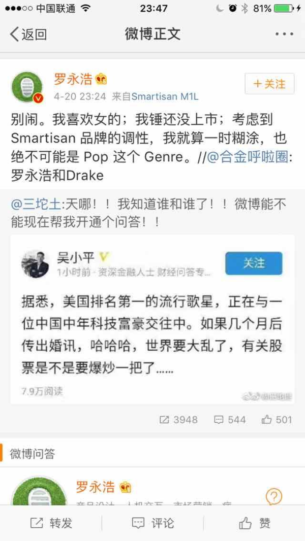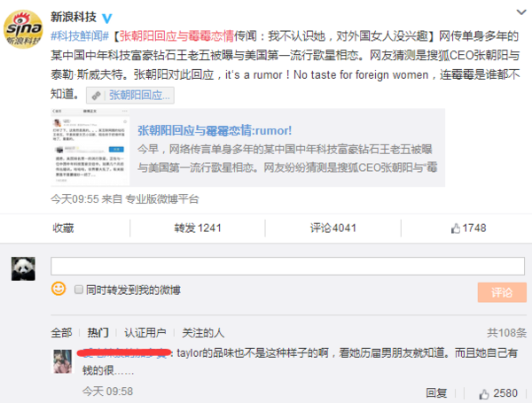 今日,張朝陽(yáng)突然登上了新浪微博熱搜,是不是決定滿臉問(wèn)候,搜狐老邁在新浪微博火了?這兩貨不是競(jìng)爭(zhēng)對(duì)手嗎?近日,網(wǎng)上瘋傳某我國(guó)中年科技富豪與美國(guó)第一流行歌星相戀,網(wǎng)友紛紛猜想這是暗指搜狐CEO張朝陽(yáng)與美國(guó)歌星是霉霉。但遭遇張朝陽(yáng)強(qiáng)勢(shì)否定,稱“我不認(rèn)識(shí)她,對(duì)外國(guó)女性沒(méi)興趣”。 這下網(wǎng)友評(píng)論的更熱鬧了,有霉霉粉絲出來(lái)辯駁稱taylor的品嘗不止如此,看她歷屆男朋友就知道,并且她自個(gè)有錢(qián)的很,言下之意即是霉霉還看不中張朝陽(yáng)呢。 一起有人為霉霉抱屈,稱張朝陽(yáng)急著跳出來(lái)回答給自個(gè)加戲,正本張朝陽(yáng)不出來(lái)回答,沒(méi)人專注這個(gè)事,也上不了熱搜,他出來(lái)加個(gè)戲,鍋還要女方背。 相較于粉絲的嘴炮,筆者更關(guān)心的是這場(chǎng)緋聞的真實(shí)性,究竟是確有其事,仍是一場(chǎng)營(yíng)銷呢?如果不是空穴來(lái)風(fēng),這個(gè)中年科技富豪究竟是誰(shuí)呢? 有趣的是,在緋聞事件還沒(méi)有多少人重視的時(shí)分,錘子科技的羅永浩第一時(shí)間跳出來(lái)撇清聯(lián)系表明:“別鬧,我喜愛(ài)女的……我就算一時(shí)糊涂,也絕不可能是Pop這個(gè)Genre。”被網(wǎng)友戲稱活潑得像高仿號(hào)。 聯(lián)系我國(guó)互聯(lián)網(wǎng)、中年、對(duì)股票有影響、富豪,本身契合條件的就沒(méi)幾個(gè)。 首要必定不是雷軍,由于雷軍英語(yǔ)不行。 劉強(qiáng)東和奶茶妹妹好著呢,也不太像。 難道是常往美國(guó)跑的賈躍亭?但現(xiàn)在的樂(lè)視風(fēng)波不斷,近期和易道的“羈絆”想必夠讓賈躍亭焦頭爛額了,賈躍亭的可能性也不大。 值得注意的事,在導(dǎo)致廣泛重視之后,爆料的原博就刪掉了這條微博,難道這次爆料是坑爹的?圍觀大眾怎么看? |