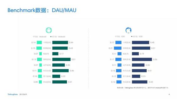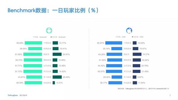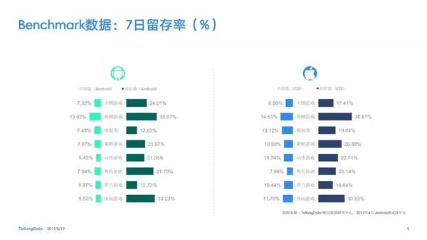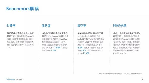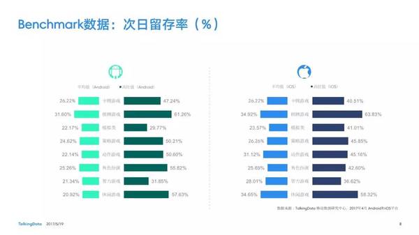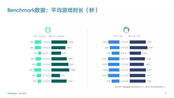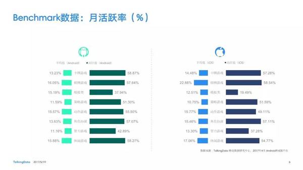 付費率:2017年4月,移動游戲在Android和iOS渠道的付費率保持安穩(wěn),其間,角色扮演、動作和戰(zhàn)略等偏重度類型移動游戲的付費率環(huán)比上月略有降低; 用戶活潑度:2017年4月,Android和iOS渠道移動游戲用戶的活潑度(Dau/Mau)全體保持安穩(wěn)運轉(zhuǎn)態(tài)勢,其間,iOS渠道角色扮演類移動游戲的周活潑率環(huán)比增加13.5%,月活潑率環(huán)比增加1.2%; 用戶留存率:2017年4月,移動游戲用戶在Android和iOS渠道的用戶留存狀況有升有降;iOS渠道棋牌類移動游戲的一日玩家份額比較上月增加2.2%,而其次日留存率比較上月降低6.7%,7日留存率則比較上月降低11.4%; 運用時長&次數(shù):2017年4月,移動游戲用戶的日均游戲次數(shù)在Android和iOS渠道整體有所增加,其間,休閑、卡牌類移動游戲的日均游戲次數(shù)的增幅相對較高;移動游戲用戶的均勻運用時長在Android渠道保持安穩(wěn),而在iOS渠道略有降低。 |
