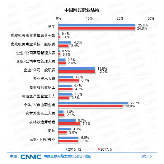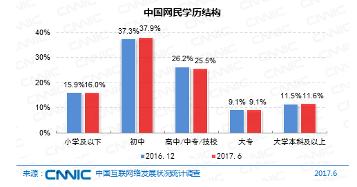 在學歷構成上,我國網(wǎng)民依然以中等學歷集體為主,初中、高中/中專/技校學歷的網(wǎng)民占比別離為37.9%、25.5%。與2016年末比較,網(wǎng)民的學歷結構改變不大。