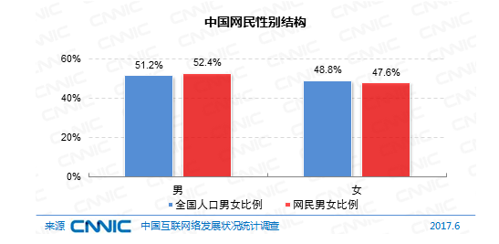 在性別構成上,我國網(wǎng)民男女份額為52.4:47.6,同期全國人口男女份額為51.2:48.8,網(wǎng)民性別結構趨向均衡,且與人口性別份額根本共同。