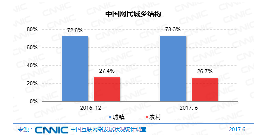 在城鄉(xiāng)結構上,我國網(wǎng)民中農(nóng)村網(wǎng)民占比26.7%,規(guī)劃為2.01億;鄉(xiāng)鎮(zhèn)網(wǎng)民占比73.3%,規(guī)劃為5.50億,較2016年末添加1988萬人,半年增幅為3.7%。