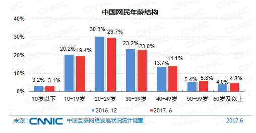 在年紀構成上,我國網(wǎng)民仍以10-39歲集體為主,占全體的72.1%:其間20-29歲年紀段的網(wǎng)民占比最高,達29.7%,10-19歲、30-39歲集體占比別離為19.4%、23.0%。與2016年末比較,40歲及以上中高齡集體占比添加1.7個百分點,互聯(lián)網(wǎng)繼續(xù)向這個年紀集體浸透。