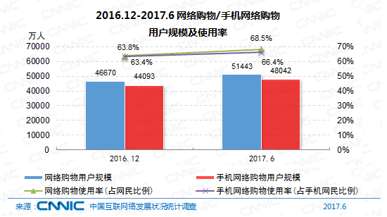 到2017年6月,我國網(wǎng)絡購物用戶規(guī)劃到達5.14億,相較2016年末添加10.2%,其間,手機網(wǎng)絡購物用戶規(guī)劃到達4.80億,半年添加率為9.0%,運用份額由63.4%增至66.4%。