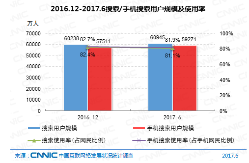 到2017年6月,我國搜索引擎用戶規(guī)劃達6.09億,運用率為81.1%,用戶規(guī)劃較2016年末添加707萬,添加率為1.2 %;手機搜索用戶數(shù)達5.93億,運用率為81.9%,用戶規(guī)劃較2016年末添加1760萬,添加率為3.1%。