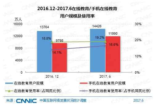 到2017年6月,我國在線教育用戶規(guī)劃達1.44億,較2016年末添加662萬人,半年添加率為4.8%;在線教育用戶運用率為19.2%,較2016年末添加0.4個百分點。其間,手機在線教育用戶規(guī)劃為1.20億,與2016年末比較添加2192萬人,添加率為22.4%;手機在線教育用戶運用率為16.6%,比較2016年末添加2.5個百分點。
