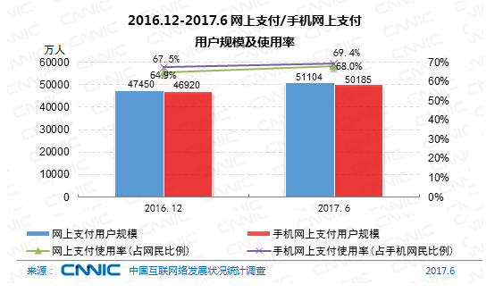 到2017年6月,我國運用網(wǎng)上付出的用戶規(guī)劃到達5.11億,較2016年12月,網(wǎng)上付出用戶添加3654萬人,半年添加率為7.7%,我國網(wǎng)民運用網(wǎng)上付出的份額從64.9%提高至68.0%。其間,手機付出用戶規(guī)劃添加迅速,到達5.02億,半年添加率為7.0%,網(wǎng)民手機網(wǎng)上付出的運用份額由67.5%提高至69.4%。