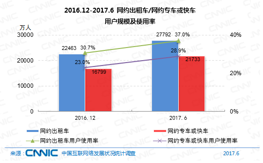 到2017年6月,我國網(wǎng)約出租車用戶規(guī)劃到達2.78億,較2016年末添加5329萬,添加率為23.7%。網(wǎng)約專車或快車用戶規(guī)劃到達2.17億,添加率為29.4%,用戶運用份額由23%提高至28.9%。