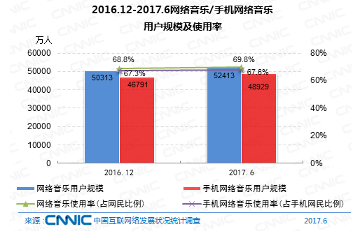 到2017年6月,網(wǎng)絡音樂用戶規(guī)劃到達5.24億,較去年末添加2101萬,占網(wǎng)民全體的69.8%。其間手機網(wǎng)絡音樂用戶規(guī)劃到達4.89億,較去年末添加2138萬,占手機網(wǎng)民的67.6%。