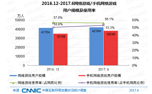 到2017年6月,我國網(wǎng)絡游戲用戶規(guī)劃到達4.22億,較去年末添加460萬,占全體網(wǎng)民的56.1%。手機網(wǎng)絡游戲用戶規(guī)劃為3.85億,較去年末添加3380萬,占手機網(wǎng)民的53.3%。