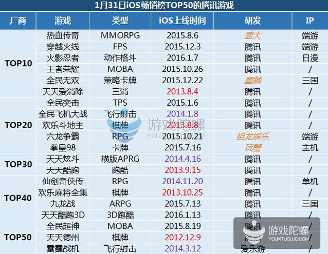 (僅統(tǒng)計(jì)2016年1月31日App Store當(dāng)天暢銷榜,騰訊發(fā)行游戲排名) 實(shí)在我們結(jié)合這幾年的騰訊手游發(fā)行情況,騰訊的主要策略仍是獲取用戶為主,由于在之前幾年中渠道擁有很大的上風(fēng)。騰訊70%的產(chǎn)品都是基于大品類籠蓋,包括跑酷、飛行射擊。但跟著人口紅利上風(fēng)衰減,用戶不斷成熟,渠道已經(jīng)不能決定用戶選擇游戲的方向,游戲本身的質(zhì)量已經(jīng)越來越重要,越來越多的用戶開始有了明確需求。細(xì)分市場(chǎng),垂直用戶以及精品產(chǎn)品成為了騰訊的基本打法,這一策略也被市場(chǎng)所驗(yàn)證。不外手游生命周期的題目,依舊困擾著所有從業(yè)者,如何延長(zhǎng)?最靠譜的方式仍是MMO,這個(gè)被端游、頁游市場(chǎng)驗(yàn)證過的形式。不光騰訊,2016年所有的大廠都往這個(gè)方向靠攏。 2015年騰訊發(fā)行的重點(diǎn)產(chǎn)品已經(jīng)集中在了重度類型,當(dāng)然騰訊內(nèi)部的分類沒有輕、中、重,而是按類型分,以這個(gè)尺度看:卡牌、休閑、MOBA、FPS四類為主。IP類產(chǎn)品在騰訊2015的手游中表現(xiàn)十分凸起。但顯然騰訊還有大量的IP產(chǎn)品和來自合作CP的產(chǎn)品。