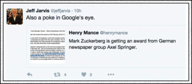 【圖說:在谷歌陣營(yíng)的人看來,這場(chǎng)流動(dòng)來者不善。聞名的親谷歌學(xué)者杰夫·杰維斯開玩笑說:這不是戳谷歌的眼睛嗎!】 谷歌是傳統(tǒng)媒體的敵人,臉書也是。不外,此一時(shí),彼一時(shí),合縱聯(lián)橫的政治婚姻、神圣聯(lián)盟隨時(shí)都會(huì)泛起。傳統(tǒng)媒體指望通過這樣的借力使力,在縫隙間生存,讓自己借機(jī)發(fā)展壯大,是一廂情愿的。但是,傳統(tǒng)媒體的確不能關(guān)起來門來自?shī)首詷罚路甲再p,必需與狼共舞,踩著高科技的節(jié)奏飛上一會(huì)。 此外,高科技巨頭們對(duì)于新聞業(yè)發(fā)展的貢獻(xiàn),也是無法無視的,事實(shí)上,后人們?cè)谧珜懶侣勈返臅r(shí)候,谷歌、臉書這些門外的野蠻人將成為當(dāng)然的主角,全球各地精英新聞學(xué)院出身的精英專業(yè)人士,從來不是新聞史臺(tái)面上確當(dāng)然主角,也永遠(yuǎn)不會(huì)是(很殘酷,是不是?但符合顛覆者不來自內(nèi)部的鐵律)。施普林格把第一個(gè)施普林格獎(jiǎng)?lì)C給小扎,小扎當(dāng)之無愧。而那個(gè)沒有泛起在頒獎(jiǎng)儀式上助興的谷歌,假如馬塞亞斯·多夫納足夠大度的話,同樣應(yīng)該在某年授與其一個(gè)大獎(jiǎng)。由于,谷歌對(duì)于新聞業(yè)的發(fā)展作出的貢獻(xiàn),比臉書早,迄今為止,也一點(diǎn)不比臉書小。當(dāng)然,谷歌對(duì)于新聞業(yè)的轔轢與臉書一樣,怎么評(píng)估都不會(huì)過份。 歷史,不都是以這樣的方式寫就的嗎? 稍等,新聞業(yè)(journalism)這個(gè)詞在有了谷歌與臉書之后,是不是需要重新定義了?在中國(guó),有了早年的新浪、網(wǎng)易、搜孤,稍后的 BAT 之后,是不是也需要重新定義了?新聞早就不是原來的那個(gè)新聞,新聞業(yè)也早就不再是早先的那個(gè)新聞業(yè)了。