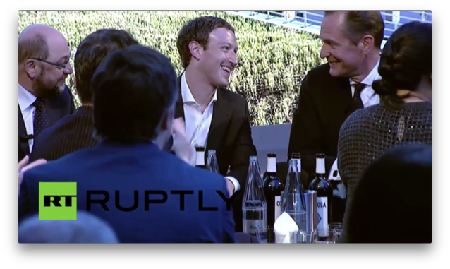 【圖說:施普林格官網(wǎng)及其旗下的眾多報(bào)紙,發(fā)布了良多照片造勢(shì),但這樣“哥倆好”的畫面及會(huì)場(chǎng)全景只能辛勞地到俄國(guó)人發(fā)布的視頻中去截圖。RT威武! 歐洲反谷歌旗手、阿克塞爾·施普林格團(tuán)體CEO馬塞亞斯·多夫納(上圖為小扎頒獎(jiǎng)?wù)撸┰陬C獎(jiǎng)儀式上給了扎克伯格高度的評(píng)價(jià),這樣的評(píng)價(jià)大家早就耳熟能詳了,值得引述的只有這一句,“Facebook 作為一個(gè)成功的分發(fā)平臺(tái),是媒體的公平(fair)伙伴”。這句話,可能半真半假,似是而非,良多媒體人與媒體機(jī)構(gòu)是并不認(rèn)同的。多夫納心里,可能也并不完全是這樣想的,只是,與谷歌比擬,他們還沒有反目。 扎克伯格在儀式上,也只撿大家愛聽的講。好比,他在獲獎(jiǎng)感言中揄?yè)P(yáng)自己換尿布的技術(shù)如何高明,花20秒就可以搞定。他也不忘了談一下他的標(biāo)牌性T恤。這些輕松的話題,讓他與一房子的老歐洲精英們一起會(huì)心地微笑。那些嚴(yán)厲的具有爭(zhēng)議的重大方向性話題,以及門外零星的抗議者,換個(gè)場(chǎng)合再議吧。 為了表示對(duì)于頒獎(jiǎng)?wù)叩淖鹬,小扎換了身西服,但是,為了表示他不向金科玉律屈服,他仍舊率性地不戴領(lǐng)帶。