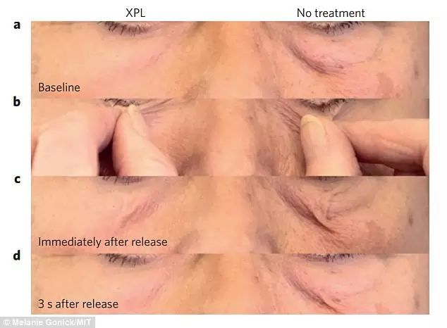 (圖8、還防水喲) 據(jù)研究職員表示,薄膜能在皮膚上施展很好的保護(hù)作用,減少水分流失,有望用于治療濕疹等皮膚病! 假如加入防曬霜成分,這種薄膜還可能起到防曬作用! 對(duì)了,由于聚硅氧烷對(duì)可見(jiàn)光沒(méi)有顯著的吸收,厚度僅40至70微米,所以…… 它不但看起來(lái)基本和正常皮膚沒(méi)太大差別,而且還能消除眼袋和皺紋! 下面是科學(xué)家做的一組對(duì)比實(shí)驗(yàn)數(shù)據(jù),戴上它1小時(shí)和4小時(shí)后,眼袋和皺紋都有顯著的減少。!