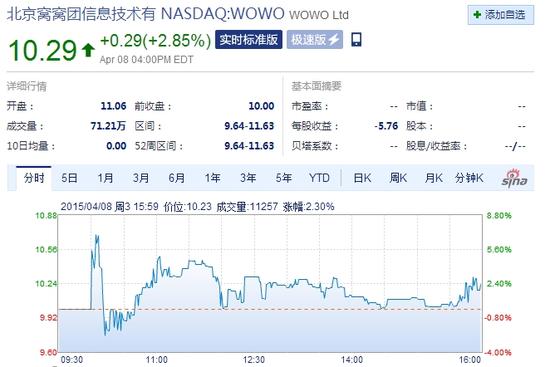 ![]() 新浪科技訊 北京時(shí)間4月9日凌晨動(dòng)靜,窩窩團(tuán)在美國納斯達(dá)克全球市場成功掛牌交易,股票代碼為“WOWO”,發(fā)行價(jià)為每股ADS 10美元,每股ADS代表18股普通股,融資4000萬美元。窩窩團(tuán)開盤價(jià)報(bào)以11.06美元,較發(fā)行價(jià)上漲10%,市值約為4.5億美元。隨后,股價(jià)震蕩,一度跌破發(fā)行價(jià)。 窩窩團(tuán)已授予IPO承銷商在30天內(nèi)額外購買60萬股ADS的逾額配售權(quán)。IPO發(fā)行的這400萬股ADS均由窩窩團(tuán)提供,不計(jì)入承銷商的逾額配售權(quán)。另外,窩窩團(tuán)啟用新的品牌名稱——窩窩。 窩窩團(tuán)上市開盤后在10美元四周區(qū)間產(chǎn)生強(qiáng)烈波動(dòng),截至收盤較發(fā)行價(jià)微漲2.85%報(bào)10.29美元。 |