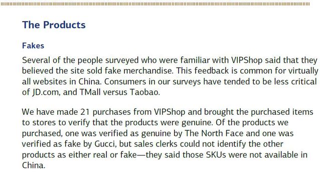對(duì)于閃購模式的唯品會(huì)而言,品牌在劃定的時(shí)間內(nèi)上新,通過折扣的方式,來刺激消費(fèi)者快速?zèng)Q議計(jì)劃購買。在唯品會(huì)的首頁上,每個(gè)品牌上新的位置都很有限,也都意味著巨大的利益牽扯。一位曾上過唯品會(huì)的商家透露,唯品會(huì)在招商控制上層層審批,但想上唯品會(huì)(特別是首頁)的品牌商趨之若鶩。即便治理上很嚴(yán)格,但仍是避免不了一些“潛規(guī)則”。 事實(shí)上,聯(lián)系關(guān)系交易本身并不違法,根據(jù)SEC的要求,與上市公司產(chǎn)生聯(lián)系關(guān)系交易的行為必需要對(duì)外表露。這也是考慮到,聯(lián)系關(guān)系交易方可以運(yùn)用行政氣力撮合交易的進(jìn)行,從而有可能使交易的價(jià)格、方式等在非競(jìng)爭(zhēng)的前提下泛起不公正情況,形成對(duì)股東或部門股東權(quán)益的侵犯,也易導(dǎo)致債權(quán)人利益受到損害。 售賣未經(jīng)品牌商授權(quán)的商品 贗品對(duì)于電商來說,是一個(gè)“惡疾”。JCAP講演中夸大,調(diào)查了多位消費(fèi)者,均表示在唯品會(huì)上買到過贗品。 JCAP調(diào)查職員抽選了21個(gè)調(diào)查樣本,去品牌商的線下實(shí)體店驗(yàn)貨,其中樣本中的Gucci被證明為贗品,其余的商品樣本,銷售職員也無法辨明真?zhèn)巍?ldquo;這些商品的型號(hào)并沒有在中國銷售。”