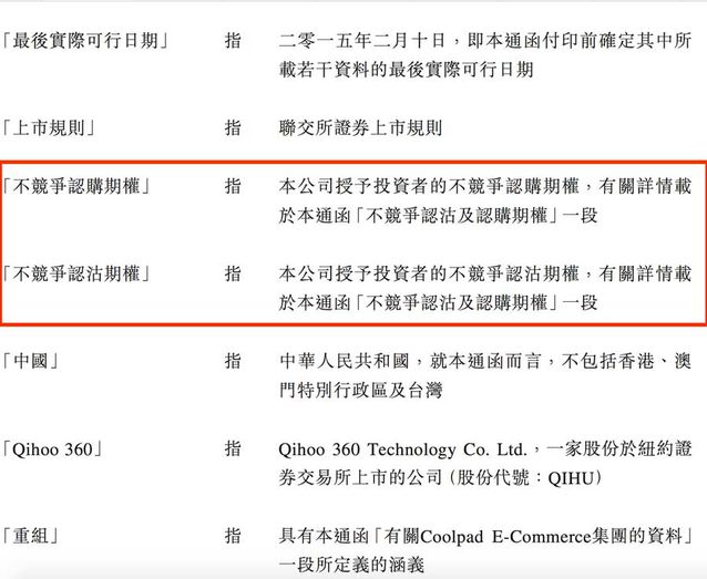 360和酷派正在經(jīng)歷著一場(chǎng)明爭(zhēng)冷戰(zhàn),跟著上周360祭出要求酷派以14.85億美元認(rèn)沽奇酷公司期權(quán)這個(gè)殺招后,兩家的關(guān)系徹底撕破,也開(kāi)始了互相扯皮的口水戰(zhàn)。這邊酷派稱(chēng)360沒(méi)有履行合約內(nèi)容,360則發(fā)布聲明稱(chēng)酷派違背了競(jìng)爭(zhēng)協(xié)議,一時(shí)間到底誰(shuí)說(shuō)謊了呢?包括價(jià)值兄在內(nèi)的各位,想必都想直到背后的真相到底是什么吧。價(jià)值兄這里拿到了當(dāng)時(shí)360與酷派合作時(shí)候簽署的協(xié)議的全部?jī)?nèi)容,獨(dú)家還原兩家當(dāng)初還甜美如初戀的公司,為什么會(huì)走向不共戴天的地步。 焦點(diǎn)一:14.85億美元認(rèn)沽權(quán)到底該不該得到支持 上周360發(fā)布聲明稱(chēng),酷派違背同業(yè)競(jìng)爭(zhēng)協(xié)議,360決定行使相關(guān)認(rèn)沽期權(quán),將其所持有的全部股權(quán)按市場(chǎng)價(jià)的兩倍出售給酷派公司,即要求酷派以?xún)杀兜膬r(jià)格回購(gòu)360所持有的49.5%的奇酷科技股權(quán)(價(jià)值7.425億美元),總金額為14.85億美元。面臨市值僅6.68億美元(截至2015年9月11日收盤(pán),酷派市值51.80億港幣)的酷派,可謂難于登天。 那么到底360和酷派簽署的協(xié)議是怎么劃定的呢??jī)r(jià)值兄這里獨(dú)家拿到了協(xié)議的全文,第一時(shí)間提供應(yīng)各位查閱(如下圖)。 圖1-2是酷派和360簽署的的股東,可以看出來(lái),酷派團(tuán)體與360在2015年2月12日簽署了這份協(xié)議,已經(jīng)在圖4的香港有關(guān)部分公然表露,完全具備法律效力。