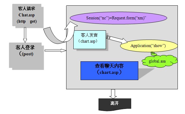 ![]() 聊天室處理流程 Global.asa文件的格局 global.asa文件實(shí)在是一個(gè)可選文件,它是專(zhuān)門(mén)存放全局變量和局部變量的文件,即在這里聲明具有會(huì)話(huà)和應(yīng)用程序作用域的變量,同時(shí)還可以指定事件程序,客戶(hù)端是看不到該文件的,它存放在應(yīng)用程序的根目錄下,文件名必需是global.asa,每人應(yīng)用程序只能有一個(gè)global.asa文件,文本中不能有HTML標(biāo)記,不答應(yīng)更改文件名。格局如下: <script language=”VBScript ” runat=”Server”> Sub session_OnStart 當(dāng)客戶(hù)首次運(yùn)行ASP應(yīng)用程序中的任一頁(yè)面時(shí)運(yùn)行。 …….. End sub Sub session_OnEnd 當(dāng)某客戶(hù)會(huì)話(huà)超時(shí)或退出應(yīng)用程序時(shí)運(yùn)行。 …….. End sub Sub Application_Onstart 當(dāng)任何客戶(hù)首次訪(fǎng)問(wèn)該應(yīng)用程序的首頁(yè)面時(shí)運(yùn)行。 …….. End sub Sub Application_OnEnd 當(dāng)該站點(diǎn)的WEB服務(wù)器封閉時(shí)運(yùn)行。 …….. End sub </script> |