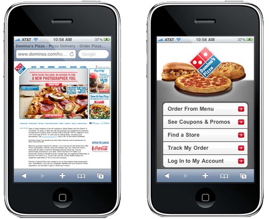 假如你但愿自己的網(wǎng)站能夠輕松的在移動端設(shè)備上訪問,那么應(yīng)當(dāng)消除所有移動端上可能存在的可用性的題目,下面有12條晉升移動端網(wǎng)頁設(shè)計的建議,確保你的頁面能夠通過 可用性測試,并提供良好的用戶體驗(yàn)。 1、針對移動端進(jìn)行全面優(yōu)化 桌面端網(wǎng)頁在移動端設(shè)備上首要的障礙就是導(dǎo)航的使用?纯聪旅鍰omino批薩的案例,它的桌面端和移動端網(wǎng)頁的對比就相稱顯著,移動端頁面經(jīng)由優(yōu)化之后的體驗(yàn)就完全不同。簡樸說來,優(yōu)化后的移動端頁面更加干凈,有著更輕易導(dǎo)航的CTA按鈕
