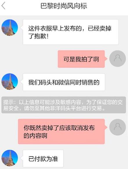 1元搶購成功賣家拒不發(fā)貨 當(dāng)天1元搶購成功后,陳同學(xué)很快收到了巴黎時尚風(fēng)向標(biāo)店鋪發(fā)來的動靜,賣家表示商品已經(jīng)賣出無法給陳同學(xué)發(fā)貨,同時表示,這件衣服的價格并不是1元,是為了最快發(fā)布才填上去的。 ![]()