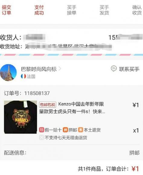 一件kenzo衛(wèi)衣讓武漢的陳同學(xué)(化名)走上了維權(quán)的道路。 11月25日,陳同學(xué)在洋碼頭“巴黎時尚風(fēng)向標(biāo)”以1元的價格搶得一件原價1599元kenzo虎頭衛(wèi)衣。誰知付款成功后,賣家卻并不愿意發(fā)貨。 為了維護自己的權(quán)益,陳同學(xué)與洋碼頭、巴黎時尚風(fēng)向標(biāo)展開一場有關(guān)消費者權(quán)益保護的斗爭。 ![]()