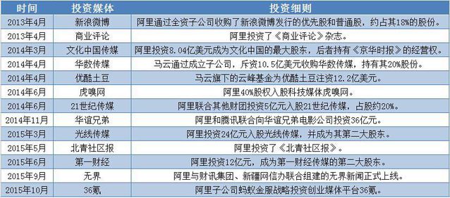 據(jù)悉,封面將主打新聞客戶端,以The cover.cn網(wǎng)站為基礎(chǔ),涵蓋微博 、微信、視頻、數(shù)據(jù)、論壇、智庫等,并逐步推出多個垂直細分領(lǐng)域的產(chǎn)品矩陣。未經(jīng)證明的傳說傳聞稱,這次阿里為了打造封面?zhèn)髅,不惜?億巨資。 四川日報作為傳統(tǒng)媒體,此刻搭上了資本的順風(fēng)車,搖身一變成為新媒體,無疑再次令不少傳統(tǒng)媒體同行艷羨不已。而阿里作為傳媒領(lǐng)域的投資老手,近兩年通過不同的資本運作方式,已控制了海內(nèi)多家媒體的話語權(quán)。 那么題目來了,阿里如斯瘋狂擴張傳媒版圖背后的邏輯到底是什么呢? 投資觸角不斷延伸,阿里瘋狂擴張傳媒版圖 從過往歷史中不難發(fā)現(xiàn),阿里此前也曾多次進行過傳媒領(lǐng)域的投資。其中,影響力最大、最深遠確當(dāng)屬阿里對第一財經(jīng)的投資。 四個月前,阿里以24億元巨額投資第一財經(jīng)的動靜瞬間引爆整個互聯(lián)網(wǎng)圈,所引起的轟動好像仍在面前。 當(dāng)時,第一財經(jīng)頂著中國唯逐一家集廣播、電視、日報、網(wǎng)站、雜志于一體的中國專業(yè)財經(jīng)媒體的光環(huán),而且其平面媒體包括海內(nèi)著名度頗高的財經(jīng)類報紙《第一財經(jīng)日報》和財經(jīng)類雜志《第一財經(jīng)周刊》,阿里的想法主意是憑借自身的資本和渠道,以及一財?shù)挠绊懥Γ瑢⒑笳叽蛟斐?ldquo;中國版彭博社”。 但阿里的野心不止步于此,實際上,自2013年開始,阿里在傳媒領(lǐng)域的投資動作就從未中斷,且投資觸角已陸續(xù)伸向傳統(tǒng)平面媒體、影視公司及新媒體。