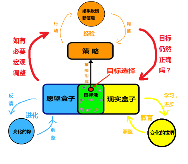 對于所有這些部門來說,盒子代表了目前的假說,圓環(huán)代表了可以被用來調(diào)整這些假說的新信息源。我們必需記住,這些圓環(huán)才是大頭,而非這些盒子——這些盒子只是盡己所能的讓圓環(huán)驕傲。假如我們和圓環(huán)內(nèi)容脫節(jié),盒子中的信息就會過期,無法有效支持決議計劃制定。 讓我們撤退退卻一步,把軟件視為一個整體。我們看到,下面是目標(biāo)形成機制,上面是目標(biāo)達(dá)成機制。實現(xiàn)目標(biāo)通常需要精準(zhǔn)聚焦。你需要放大微觀圖像,全新投入到目標(biāo)當(dāng)中,制定策略,瞄準(zhǔn)它。 但是,跟著時間推移,愿望之盒和現(xiàn)實之盒會調(diào)整自己的內(nèi)容,改變自己的形態(tài),終極,其他情況發(fā)生了——目標(biāo)池變了。 目標(biāo)池正好是愿望之盒和現(xiàn)實之盒發(fā)生重疊的地方,其外形和內(nèi)容完全取決于這些盒子的狀態(tài)。當(dāng)你糊口在位于上方的目標(biāo)達(dá)成機制中時,確保你的奮斗的對象與下方的目標(biāo)池繼承保持一致,這很重要。——所以,讓我們再加上兩個大的紅箭頭:
