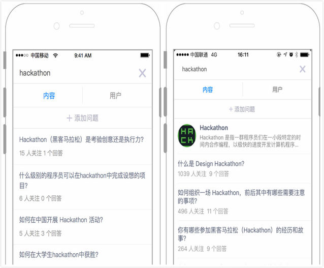 算法也做了優(yōu)化,好比搜索 hackathon,以前匹配問答中含 hackathon 這個樞紐詞的題目,這些題目質(zhì)量并不好,現(xiàn)在不僅給出高質(zhì)量的相關(guān)題目,還顯示話題。