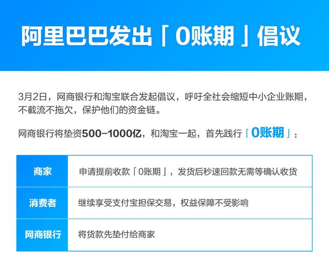 3月2日,網(wǎng)商銀行和淘寶聯(lián)合建議倡議,呼吁全社會縮短中小企業(yè)賬期,不截流不拖欠,維護(hù)他們的資金鏈;網(wǎng)商銀行將墊資500-1000億,和淘寶一起,