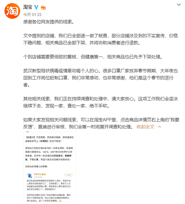 1月27日消息,今天凌晨,淘寶官方微博宣布,針對網(wǎng)友曝光有淘寶店肆口罩呈現(xiàn)不實宣傳、價格不穩(wěn)等問題,淘寶官方已對相關(guān)店肆悉數(shù)逐個核查,部分店肆涉及到的不實宣傳、