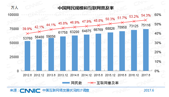 7 51億網(wǎng)民!到 2017年6月,我國互聯(lián)網(wǎng)普及率現(xiàn)已到達(dá)54 3%,非網(wǎng)民還有6 32億。昨天下午,我國互聯(lián)網(wǎng)絡(luò)信息中心(CNNIC)發(fā)布第40次