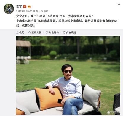 8月15日音訊,上個月,小米商城上架了一款定制版的米家太陽鏡,隨后小米雷軍試戴了該款產(chǎn)品,并頂著炎炎酷日在戶外秀了一把買家秀,其