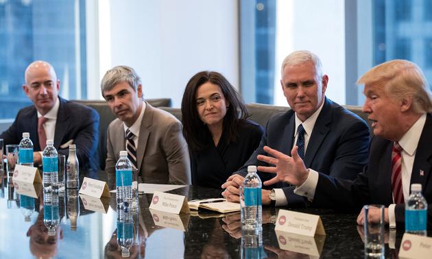 2016年12月,特朗普當(dāng)選美國(guó)總統(tǒng)后曾召集硅谷著名企業(yè)家商議,圖中左起分別為亞馬遜CEO杰夫-貝索斯、谷歌母公司Alphabet CEO拉里-佩奇