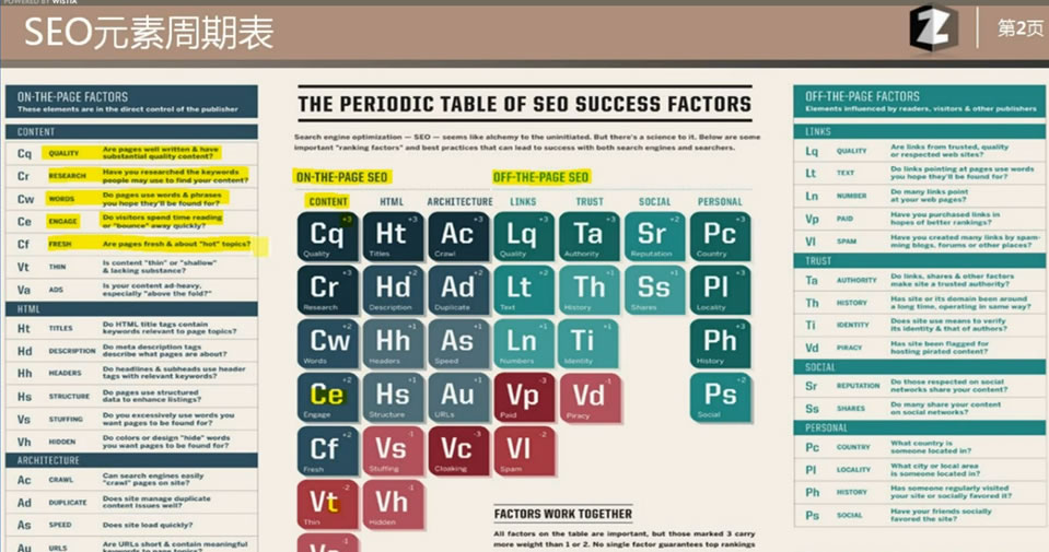 首先咱們要搞清楚怎么看這個周期表,它其實就是化學(xué)元素周期表的描摹,用可視化規(guī)劃體現(xiàn)出查找引擎優(yōu)化元素對于整個算法系統(tǒng)的重要性。