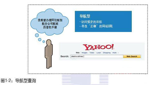 1.4.1 導(dǎo)航型查詢 導(dǎo)航型查詢的目的是直接閱讀某個(gè)特定的網(wǎng)站。在某些情況下,用戶可能不知道準(zhǔn)確的URL,查找引擎這時(shí)起到電話號(hào)碼簿的效果。