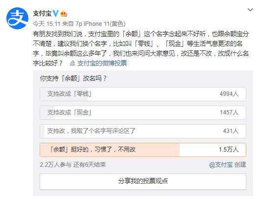 7月16日音訊,@支付寶 官方微博發(fā)布音訊稱,因部分用戶反映“余額”功用的姓名念起來不好聽,因此有了改名的計(jì)劃。但在支付寶建議的改名投票中,