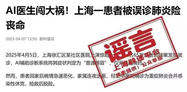 近日 有讀者向上海辟謠平臺(tái)詢問 網(wǎng)傳“AI醫(yī)生闖大禍! 上海一患者被誤診肺炎險(xiǎn)喪命”的消息 是不是真的?關(guān)于“上海患者被AI誤診喪命獲賠127萬”的消息在社交平臺(tái)和部分自媒體上傳播,