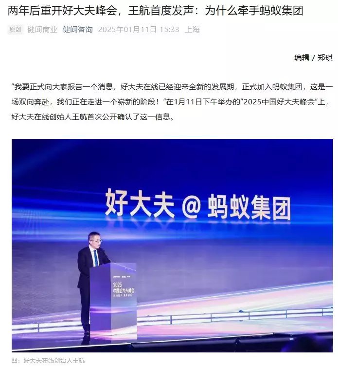 2025 年 1 月 11 日,在 “2025 好大夫峰會(huì)” 上,螞蟻集團(tuán)與好大夫在線在收購?fù)瓿珊笫锥韧_(tái)亮相,并發(fā)布了醫(yī)療服務(wù) “AI 助理”。以下是相關(guān)詳細(xì)信息: