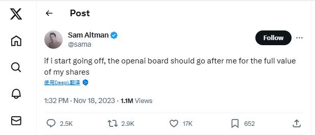 在OpenAI公司內(nèi)部,一場(chǎng)關(guān)于是否應(yīng)該“開(kāi)火”的爭(zhēng)論正在上演。 當(dāng)?shù)貢r(shí)間2月15日,阿爾特曼在推特上回應(yīng)了OpenAI聯(lián)合創(chuàng)始人兼CEO山姆·阿爾特曼(Sam Altman)周三的一條推文。