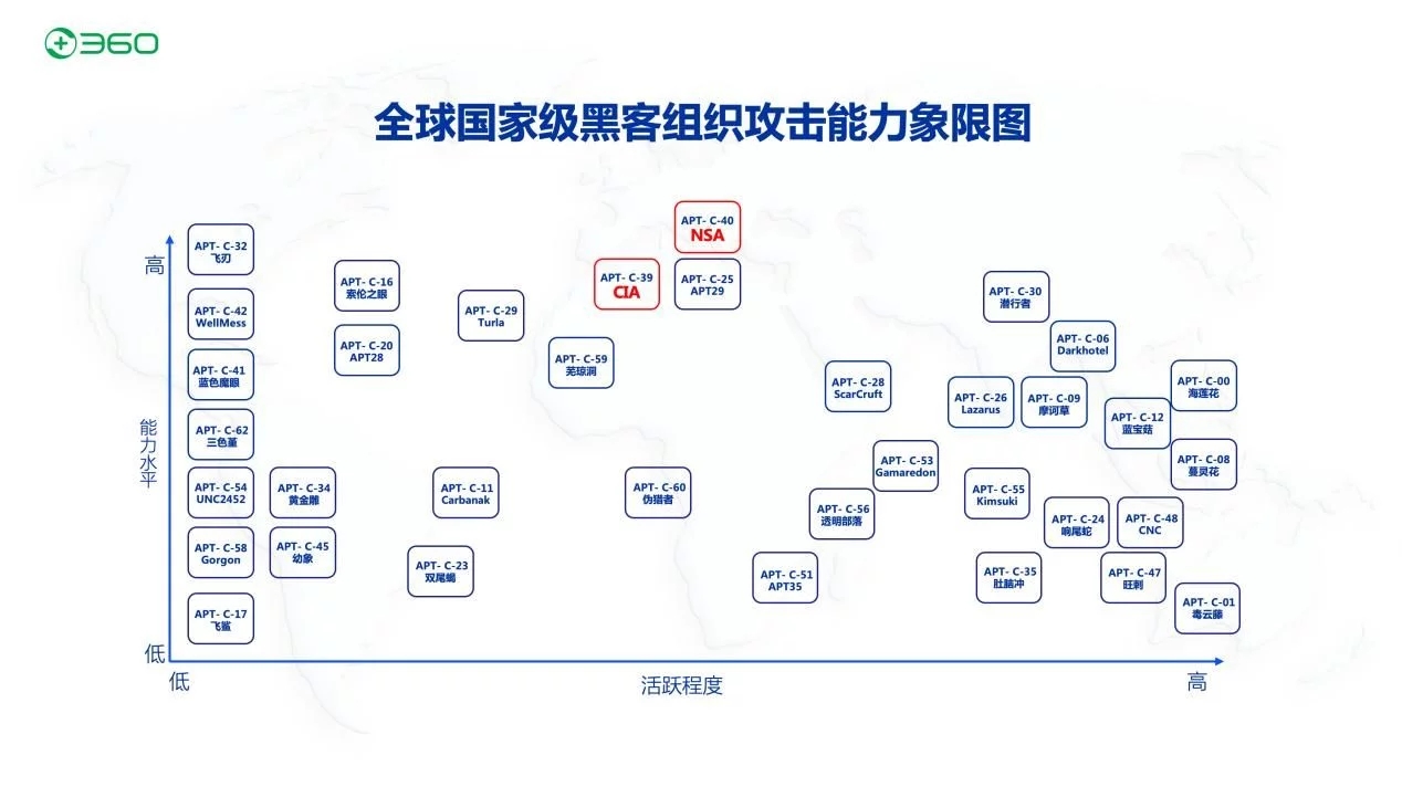 9月8日電 9月8日,三六零(601360.SH,下稱(chēng)“360”)公司發(fā)布全球首個(gè)國(guó)家級(jí)黑客安排進(jìn)犯才能象限圖,從才能水平緩活躍程度兩個(gè)維度,