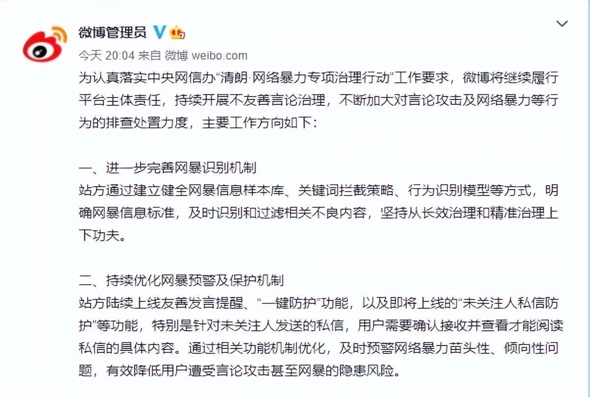 微博管理員發(fā)文稱,為認真落實中央網(wǎng)信辦“明亮清明·網(wǎng)絡暴力專項管理行動”作業(yè)要求,微博將繼續(xù)履行渠道主體職責,持續(xù)展開不友善言辭管理,