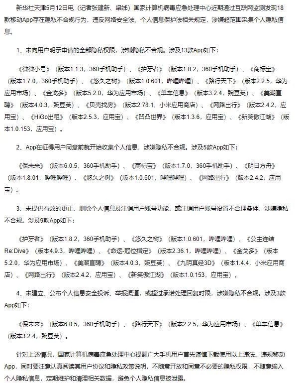 來自新華網(wǎng)5月12日的消息,國家計算機病毒應急處理中心監(jiān)測發(fā)現(xiàn)十八款APP存在隱私不合規(guī)行為,違反網(wǎng)絡安全法、個人信息保護法相關規(guī)定,